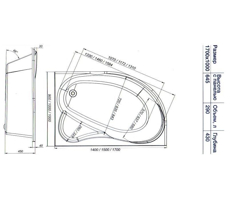 Ванна акриловая Mirsant ЯЛТА 170x100 см. левая